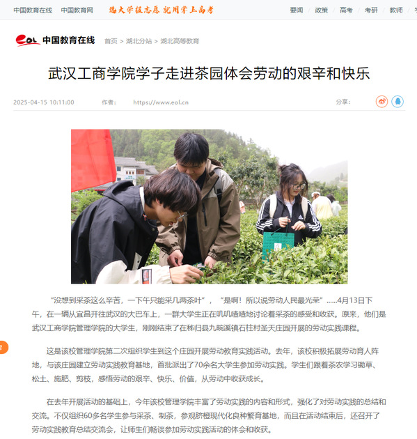 在去年开展活动的基础上,今年该校管理学院丰富了劳动实践的内容和形式,强化了对劳动实践的总结和交流。不仅组织60多名学生参与采茶、制茶,参观脐橙现代化良种繁育基地,而且在活动结束后,还召开了劳动实践教育总结交流会,让师生们畅谈参加劳动实践活动的体会和收获。
