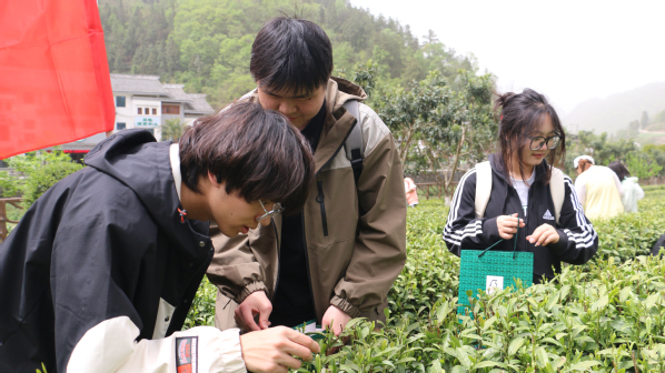 4月12日下午,在圣天庄园茶叶种植示范基地,茶厂副厂长杜太乐手把手地教学生们如何分等级采茶。在他的示范下,学生们分成五个小组开始采茶。只见他们穿梭在茶树间,按照标准仔细采摘,力求保证茶叶的质量。有的小组分工明确,配合默契,效率颇高;有的小组则遇到诸多挑战,如对茶叶品级的判断不够准确,但大家并未气馁,积极向专业人员请教。经过3个小时的劳作,学生们收获颇丰,虽然不少人已满头大汗,但脸上洋溢着劳动带来的喜悦与成就感。