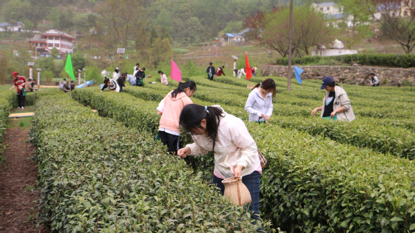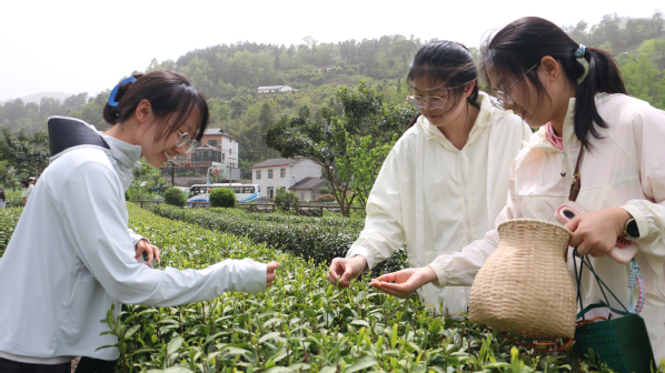 4月12日下午,在圣天庄园茶叶种植示范基地,茶厂副厂长杜太乐手把手地教学生们如何分等级采茶。在他的示范下,学生们分成五个小组开始采茶。只见他们穿梭在茶树间,按照标准仔细采摘,力求保证茶叶的质量。有的小组分工明确,配合默契,效率颇高;有的小组则遇到诸多挑战,如对茶叶品级的判断不够准确,但大家并未气馁,积极向专业人员请教。经过3个小时的劳作,学生们收获颇丰,虽然不少人已满头大汗,但脸上洋溢着劳动带来的喜悦与成就感。