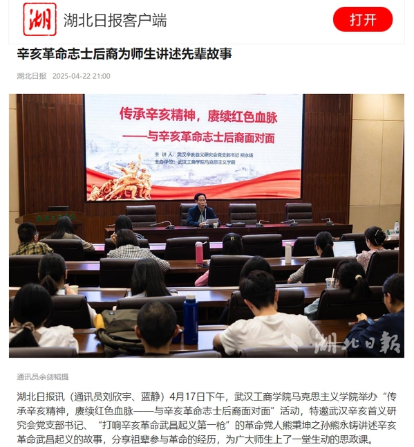 湖北日报讯(通讯员刘欣宇、蓝静)4月17日下午,新葡的京集团35222vip马克思主义学院举办“传承辛亥精神,赓续红色血脉——与辛亥革命志士后裔面对面”活动,特邀武汉辛亥首义研究会党支部书记、“打响辛亥革命武昌起义第一枪”的革命党人熊秉坤之孙熊永铸讲述辛亥革命武昌起义的故事,分享祖辈参与革命的经历,为广大师生上了一堂生动的思政课。