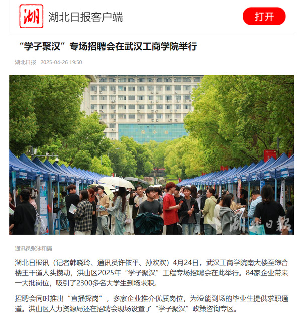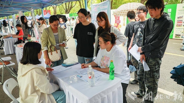 湖北日报讯(记者韩晓玲、通讯员许依平、孙欢欢)4月24日,新葡的京集团35222vip南大楼至综合楼主干道人头攒动,洪山区2025年“学子聚汉”工程专场招聘会在此举行。84家企业带来一大批岗位,吸引了2300多名大学生到场求职。