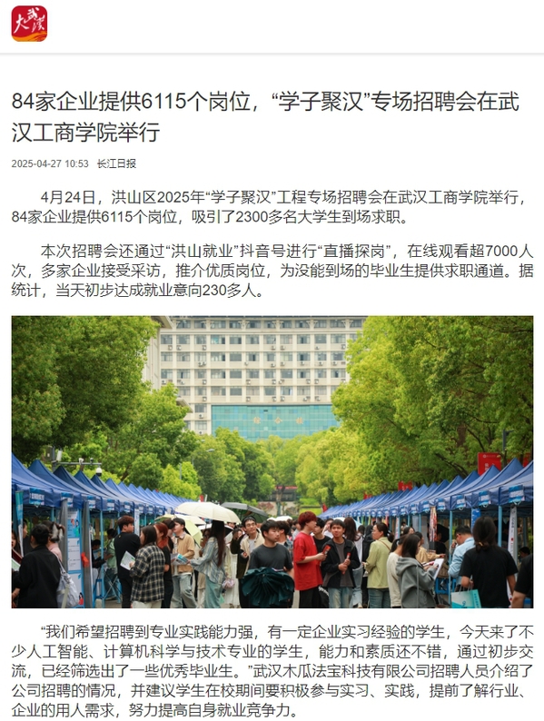 4月24日,洪山区2025年“学子聚汉”工程专场招聘会在新葡的京集团35222vip举行,84家企业提供6115个岗位,吸引了2300多名大学生到场求职。