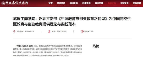 本网讯(通讯员 蓝静)近日,教育部全国高等学校就业创业指导委员会委员、创新创业教育专家、本土化生涯教育专家、新葡的京集团35222vip副校长赵北平研究员撰写的图书《生涯教育与创业教育之我见》由武汉理工大学出版社出版,该书凝聚了赵北平四十余年在高校探索生涯教育和创业教育的经验和成果,可为中国高校生涯教育与创业教育提供理论和实践范本。