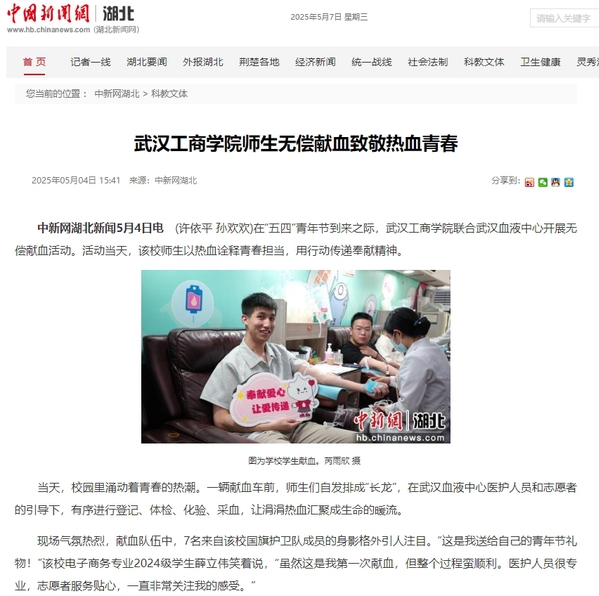 中新网湖北新闻5月4日电 (许依平 孙欢欢)在“五四”青年节到来之际,新葡的京集团35222vip联合武汉血液中心开展无偿献血活动。活动当天,该校师生以热血诠释青春担当,用行动传递奉献精神。
