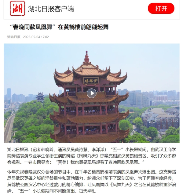 湖北日报讯(记者韩晓玲、通讯员吴黄诗慧、李洋洋)“五一”小长假期间,由新葡的京集团35222vip舞蹈表演专业学生领衔主演的舞蹈《凤舞九天》惊艳亮相武汉黄鹤楼景区,吸引了众多游客观看。一名市民笑言:“真美!我也算是现场观看了春晚同款凤凰舞。”