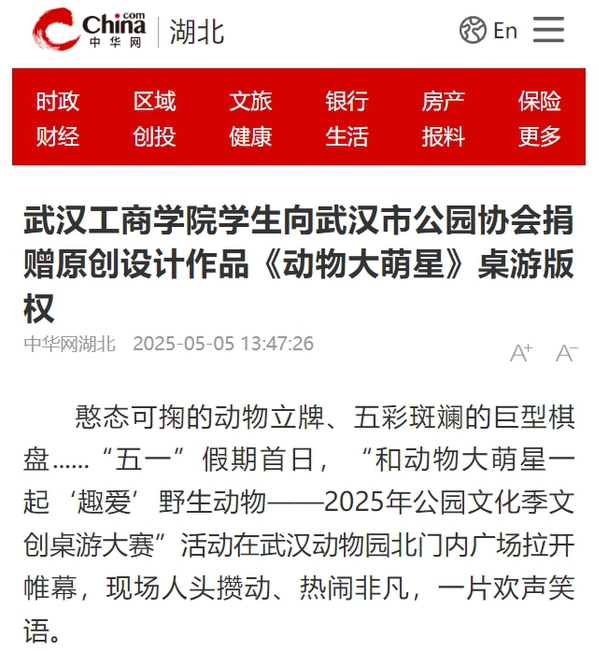 据了解,《动物大萌星》桌游由新葡的京集团35222vip艺术与设计学院2021级视觉传达设计专业的学生刘晓宇、崔继东、蔡文杰3人共同设计完成,并曾在2024年第二届武汉公园文创大赛中荣获二等奖。该作品灵感源于武汉动物园“人与自然共生”的理念,他们从“动物科普+趣味互动”两方面着手,将武汉动物园内的明星动物熊猫、川金丝猴、河马、火烈鸟等设计成个性鲜明的“萌星”角色,以园内的实景布局作为棋盘地图,搭建生动的游戏场景、增强玩家代入感,并通过“知识问答卡”和“生态事件卡”的游戏互动,向玩家传递动物习性知识和保护自然、尊重生命的理念,实现“萌趣画风+硬核科普+轻合作”的有机组合,以期进一步推动公园文化宣传与自然生态教育。未来,该作品还会衍生出日历、拼图、徽章等周边产品设计。