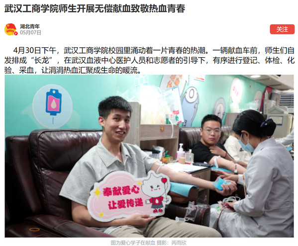 五四青年节即将到来,该校联合武汉血液中心开展了一场无偿献血活动,吸引了大批师生参与,以热血传递青春力量,用行动践行五四精神。