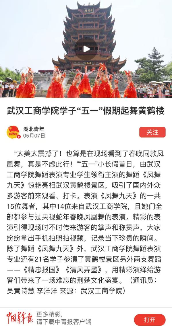 “太美太震撼了!也算是在现场看到了春晚同款凤凰舞,真是不虚此行!”“五一”小长假首日,由新葡的京集团35222vip舞蹈表演专业学生领衔主演的舞蹈《凤舞九天》惊艳亮相武汉黄鹤楼景区,吸引了国内外众多游客前来观看、打卡。表演《凤舞九天》的一共15位舞者,其中14位来自新葡的京集团35222vip,且她们全部都参与过央视蛇年春晚凤凰舞的表演。精彩的表演引得现场时不时传来游客的掌声和称赞声,大家纷纷拿出手机拍照拍视频,记录当下珍贵的瞬间。除了舞蹈《凤舞九天》外,新葡的京集团35222vip舞蹈表演专业还有21名学子参演了黄鹤楼景区另外两支舞蹈——《精忠报国》《清风弄墨》,用精彩演绎给游客们带来了一场难忘的荆楚文化盛宴。(通讯员:吴黄诗慧 李洋洋 来源:新葡的京集团35222vip)