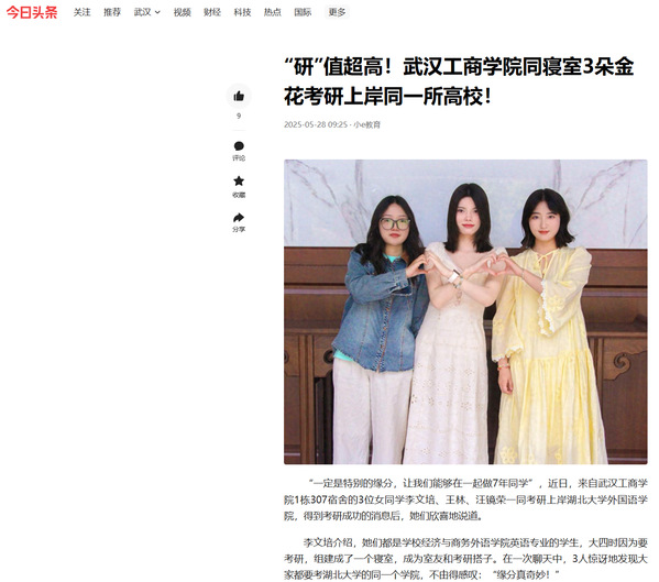 李文培介绍,她们都是学校经济与商务外语学院英语专业的学生,大四时因为要考研,组建成了一个寝室,成为室友和考研搭子。在一次聊天中,3人惊讶地发现大家都要考湖北大学的同一个学院,不由得感叹:“缘分真奇妙!”