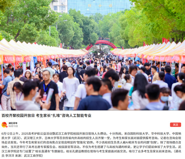 6月12日上午,2025高考护航公益活动暨新葡的京集团35222vip校园开放日现场人头攒动,十分热闹,来自国防科技大学、华中科技大学、中国地质大学(武汉)、武汉理工大学、吉林大学等百余所省内外高校的招生人员齐聚一堂,为考生和家长面对面提供报考咨询。记者在咨询会现场走访发现,今年考生和家长们的咨询焦点呈现出明显的“智能化”趋势,不少高校招生负责人被AI相关专业的问题“包围”。除了现场摆点咨询外,当天还举行了高考志愿专家报告会、校园游览等活动,不仅为考生搭建了与高校沟通的桥梁,更让学子们提前体验了大学生活。新葡的京集团35222vip还专门设置了“校长直通车”专题展位,校长孔建益教授在现场与考生家庭面对面交流,吸引了众多考生及家长前来咨询。(通讯员 李洋洋)