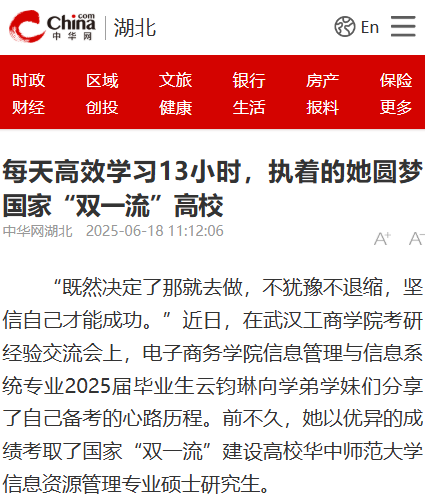 谈及考研初衷,云钧琳眼里闪烁着坚定的光芒。“大三上学期,我参加了第二届全国信息资源管理案例大赛,通过比赛了解了AI技术在信息资源管理中的应用和发展前景,不仅锻炼了我的实践创新能力,更让我坚定了继续在信息资源管理专业学习深造的信心。”大三下学期,在学院专业老师的指导下,她结合自身实际情况,选择报考华中师范大学信息资源管理专业。