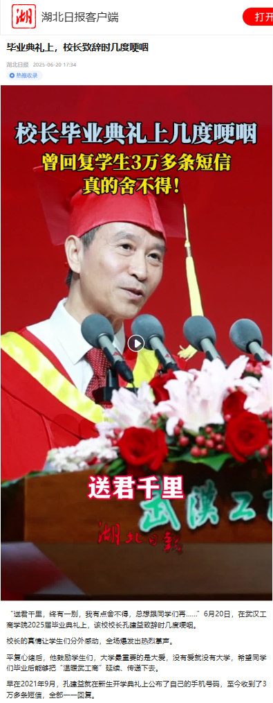 早在2021年9月,孔建益就在新生开学典礼上公布了自己的手机号码,至今收到了3万多条短信,全部一一回复。