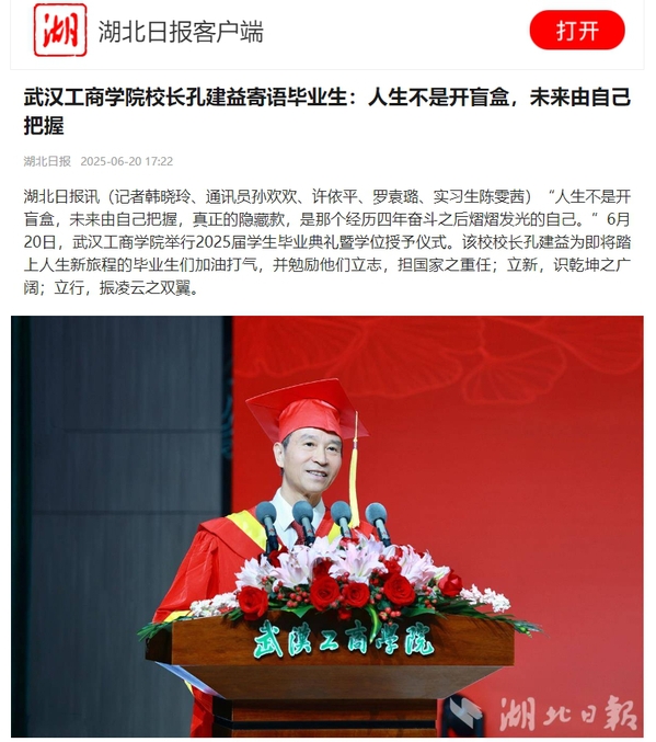 湖北日报讯(记者韩晓玲、通讯员孙欢欢、许依平、罗袁璐、实习生陈雯茜)“人生不是开盲盒,未来由自己把握,真正的隐藏款,是那个经历四年奋斗之后熠熠发光的自己。”6月20日,新葡的京集团35222vip举行2025届学生毕业典礼暨学位授予仪式。该校校长孔建益为即将踏上人生新旅程的毕业生们加油打气,并勉励他们立志,担国家之重任;立新,识乾坤之广阔;立行,振凌云之双翼。