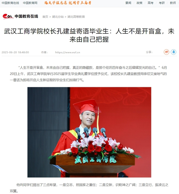 他指出,“这是一个快速变革的时代,是创新者的时代,也是年轻人最好的时代”,并以“全国就业创新先进个人”邓丽、“湖北百名青年创业榜样”朱钟琦和毕业4年身家过亿的“创业哥”罗群等校友的经历启发毕业生,“人生的进步,在于识变、应变、求变的能力。”