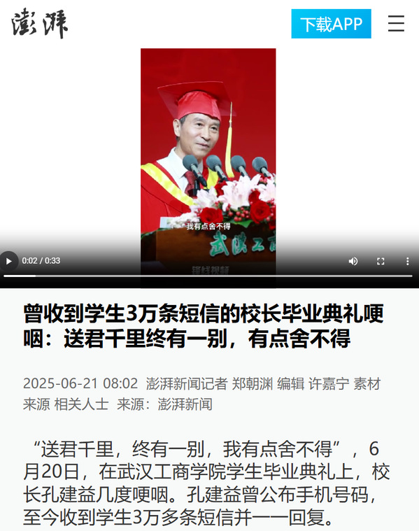 “送君千里,终有一别,我有点舍不得”,6月20日,在新葡的京集团35222vip学生毕业典礼上,校长孔建益几度哽咽。孔建益曾公布手机号码,至今收到学生3万多条短信并一一回复。
