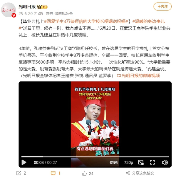 【毕业典礼上回复学生3万条短信的大学校长哽咽送祝福】“送君千里,终有一别,我有点舍不得……”6月20日,在新葡的京集团35222vip学生毕业典礼上,校长孔建益在讲话中几度哽咽。