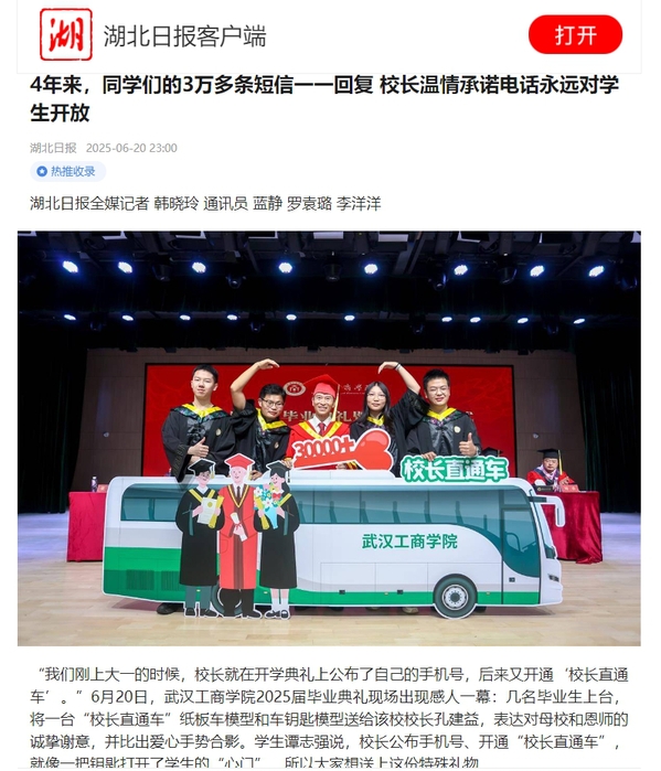 此次毕业典礼上,孔建益动情讲述了当年中学母校校长鼓励和帮助他改变命运的经历。“这位校长一直激励着我。作为人类灵魂工程师,我们最重要的是把学生培养好、把学生服务好、把学生热爱好。”他表示,这也是他向学生公布手机号、开通“校长直通车”的缘由,并鼓励学生们毕业后能够把爱与温暖传递下去。