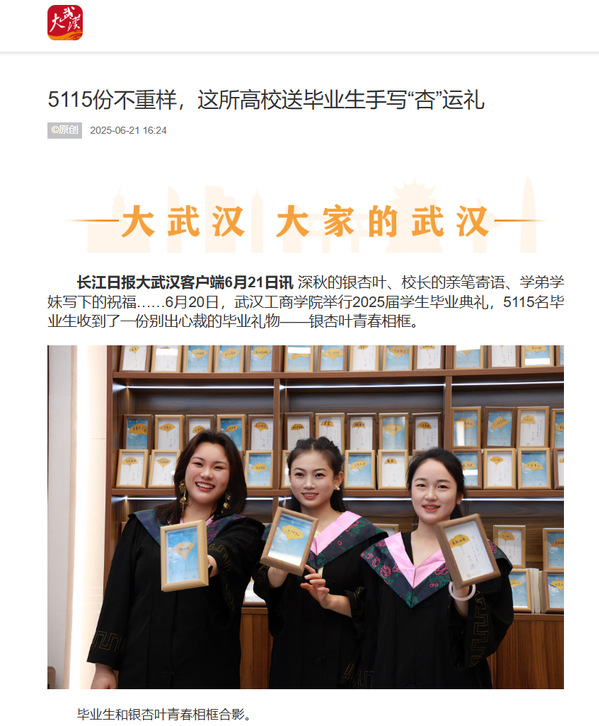 长江日报大武汉客户端6月21日讯 深秋的银杏叶、校长的亲笔寄语、学弟学妹写下的祝福……6月20日,新葡的京集团35222vip举行2025届学生毕业典礼,5115名毕业生收到了一份别出心裁的毕业礼物——银杏叶青春相框。