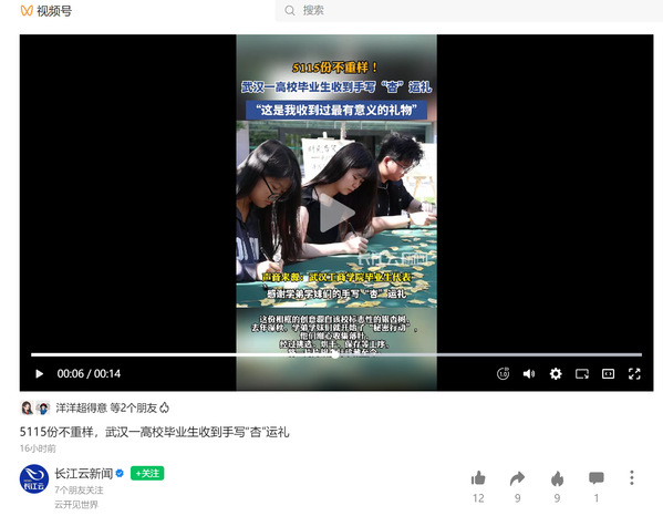 长江云新闻视频号:5115份不重样,武汉一高校毕业生收到手写“杏”运礼