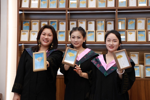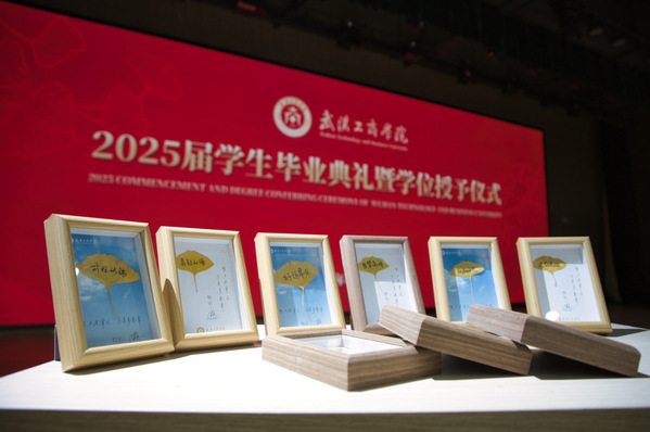 “暴富”“享瘦人生”“好运常在”……手写的祝福或俏皮活泼,或饱含深情。毕业典礼上,该校副校长刘生元亲自将这份特别的礼物送到优秀毕业生代表手中,各二级学院也在各自的学位授予仪式上送出这份礼物。不少毕业生表示,每一片叶子都承载着独特的祝福,收到相框的瞬间就像拆盲盒一样充满期待,而收获的感动更是远超预期。