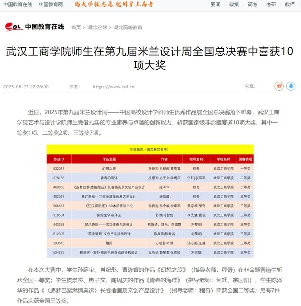 在本次大赛中,学生孙薛宝、肖纪彤、曹陈睿的作品《幻想之旅》(指导老师:程奇)在非命题赛道中斩获全国一等奖;学生皮崇岑、冉子文、陶周庆的作品《青春的海洋》(指导老师:何轩、宗国凯),学生陈泽华的作品《〈逐梦巴黎燃情奥运〉长卷插画及文创产品设计》(指导老师:程奇)荣获全国二等奖;另有7件作品荣获全国三等奖。