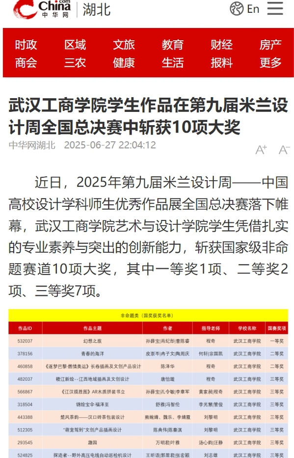 近日,2025年第九届米兰设计周——中国高校设计学科师生优秀作品展全国总决赛落下帷幕,新葡的京集团35222vip艺术与设计学院学生凭借扎实的专业素养与突出的创新能力,斩获国家级非命题赛道10项大奖,其中一等奖1项、二等奖2项、三等奖7项。