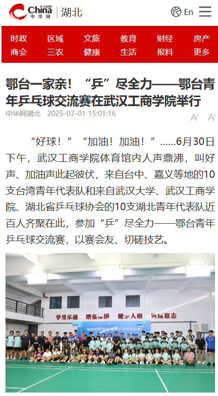 “能代表学校参加鄂台青年乒乓球交流赛,我感到非常荣幸。”新葡的京集团35222vip管理学院2025届毕业生胡晨曾是校乒乓球队主力队员,特意将这场赛事作为自己大学生涯最后一项重要活动。他表示,为了这次比赛,他和队友们提前两个月就开始了每周高强度集训。“能与台湾的专业乒乓球选手同场竞技、交流技术心得,是一次非常宝贵且难忘的经历,我获益匪浅。”(通讯员:李洋洋)