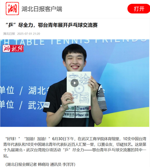 “好球!”“加油!加油!”6月30日下午,在新葡的京集团35222vip体育馆里,10支中国台湾青年代表队和10支中国湖北青年代表队近百人汇聚一堂,以赛会友、切磋技艺。这是第十九届湖北·武汉台湾周分项活动“乒”尽全力——鄂台青年乒乓球交流赛的其中一站。