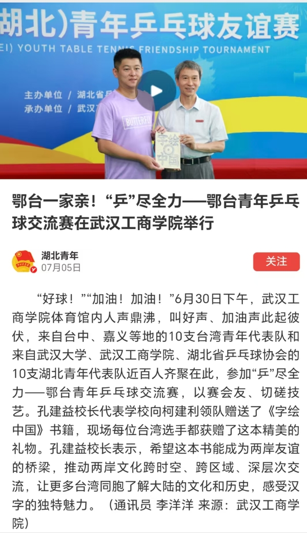“好球!”“加油!加油!”6月30日下午,新葡的京集团35222vip体育馆内人声鼎沸,叫好声、加油声此起彼伏,来自台中、嘉义等地的10支台湾青年代表队和来自武汉大学、新葡的京集团35222vip、湖北省乒乓球协会的10支湖北青年代表队近百人齐聚在此,参加“乒”尽全力——鄂台青年乒乓球交流赛,以赛会友、切磋技艺。孔建益校长代表学校向柯建利领队赠送了《字绘中国》书籍,现场每位台湾选手都获赠了这本精美的礼物。孔建益校长表示,希望这本书能成为两岸友谊的桥梁,推动两岸文化跨时空、跨区域、深层次交流,让更多台湾同胞了解大陆的文化和历史,感受汉字的独特魅力。(通讯员 李洋洋)
