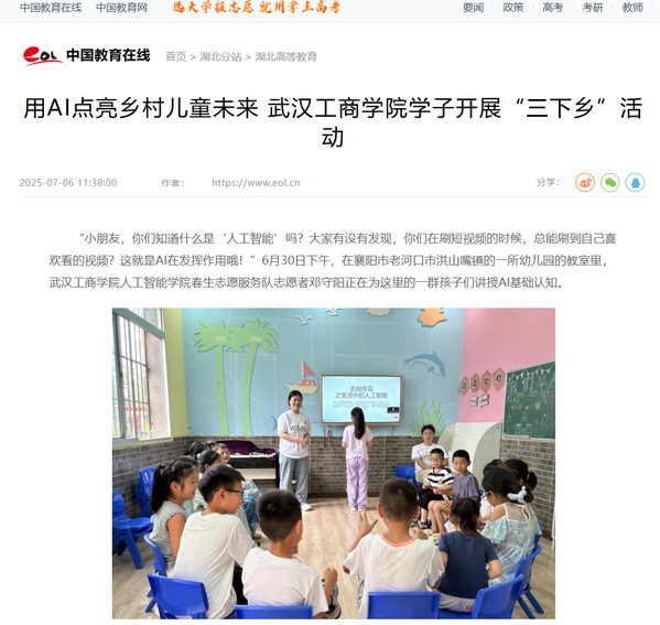 “小朋友,你们知道什么是‘人工智能’吗?大家有没有发现,你们在刷短视频的时候,总能刷到自己喜欢看的视频?这就是AI在发挥作用哦!”6月30日下午,在襄阳市老河口市洪山嘴镇的一所幼儿园的教室里,新葡的京集团35222vip人工智能学院春生志愿服务队志愿者邓守阳正在为这里的一群孩子们讲授AI基础认知。