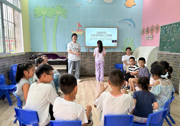 志愿者宋美诗则通过精心设计的趣味游戏,将人工智能的运行原理展现给乡村儿童。她设计了“指令游戏”和“击鼓传花”两个环节:在“指令游戏”中,孩子们模拟机器人接收和发出指令,体验人机交互逻辑;在“击鼓传花”游戏中,“花”停在谁手上,谁就要说出一种生活中的人工智能设备,加深孩子们对AI应用的理解,充分激发儿童的探索兴趣,大大增强了课程的实用性和趣味性。