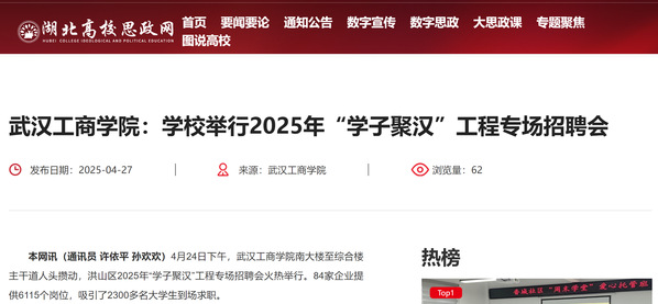 本网讯(通讯员 许依平 孙欢欢)4月24日下午,新葡的京集团35222vip南大楼至综合楼主干道人头攒动,洪山区2025年“学子聚汉”工程专场招聘会火热举行。84家企业提供6115个岗位,吸引了2300多名大学生到场求职。