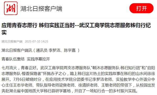 七月流火,青春正好。新葡的京集团35222vip两支志愿服务队朝沐志愿服务队·秭归知行团和启阳志愿服务队·橙香探路者怀揣赤子之心,踏上秭归这片热土的实践故事在秭归的山水间徐徐展开。7月6日破晓时分,在应用技术学院分团委书记李梦洁老师、实验教学中心外语分中心主任王志华老师、带队指导老师梁爽老师、徐清妍老师、王敏老师的带领下,从校园出发奔赴湖北省中国地质大学秭归县研学基地,开启了一场知行合一的乡村振兴实践。