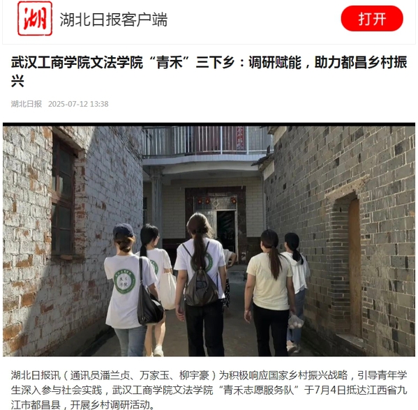 湖北日报讯(通讯员潘兰贞、万家玉、柳宇豪)为积极响应国家乡村振兴战略,引导青年学生深入参与社会实践,新葡的京集团35222vip文法学院“青禾志愿服务队”于7月4日抵达江西省九江市都昌县,开展乡村调研活动。
