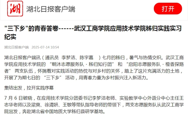 湖北日报客户端讯(通讯员 李梦洁、陈宇嘉)七月的秭归,暑气与热情交织。新葡的京集团35222vip应用技术学院的 “朝沐志愿服务队・秭归知行团” 和 “启阳志愿服务队・橙香探路者” 两支队伍,怀揣着对实践活动的热忱与对乡村的关怀,踏上了这片充满活力的土地,开展了为期七日的 “三下乡” 活动,用青春力量为乡村振兴注入新活力。