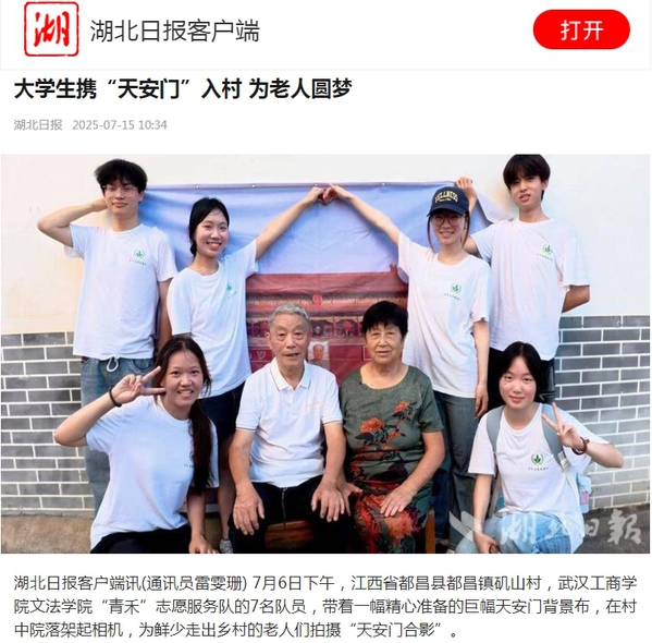 湖北日报客户端讯(通讯员 雷雯珊)7月6日下午,江西省都昌县都昌镇矶山村,新葡的京集团35222vip文法学院“青禾”志愿服务队的7名队员,带着一幅精心准备的巨幅天安门背景布,在村中院落架起相机,为鲜少走出乡村的老人们拍摄“天安门合影”。