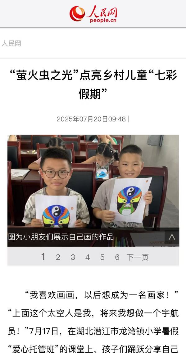 “我喜欢画画,以后想成为一名画家!”“上面这个太空人是我,将来我想做一个宇航员!”7月17日,在湖北潜江市龙湾镇小学暑假“爱心托管班”的课堂上,孩子们踊跃分享自己未来的“自画像”。原来,这是新葡的京集团35222vip“萤火虫之光”志愿服务队开展的心理健康教育课,志愿者引导孩子们通过绘画探索自我、种下梦想。这已经是该服务队连续第五年利用暑假来到龙湾镇小学开展爱心支教。