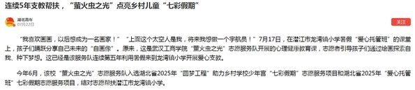 今年6月,该校“萤火虫之光”志愿服务队入选湖北省2025年“圆梦工程”助力乡村学校少年宫“七彩假期”志愿服务项目和湖北省2025年“爱心托管班”七彩假期志愿服务项目,结对志愿帮扶潜江市龙湾镇小学。