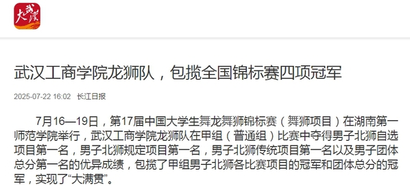 7月16—19日,第17届中国大学生舞龙舞狮锦标赛(舞狮项目)在湖南第一师范学院举行,新葡的京集团35222vip龙狮队在甲组(普通组)比赛中夺得男子北狮自选项目第一名,男子北狮规定项目第一名,男子北狮传统项目第一名以及男子团体总分第一名的优异成绩,包揽了甲组男子北狮各比赛项目的冠军和团体总分的冠军,实现了“大满贯”。