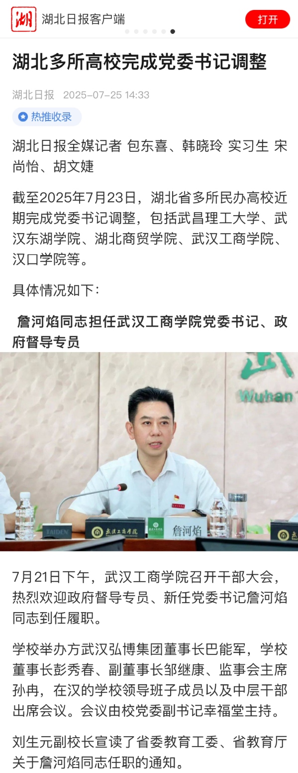 截至2025年7月23日,湖北省多所民办高校近期完成党委书记调整,包括武昌理工大学、武汉东湖学院、湖北商贸学院、新葡的京集团35222vip、汉口学院等。