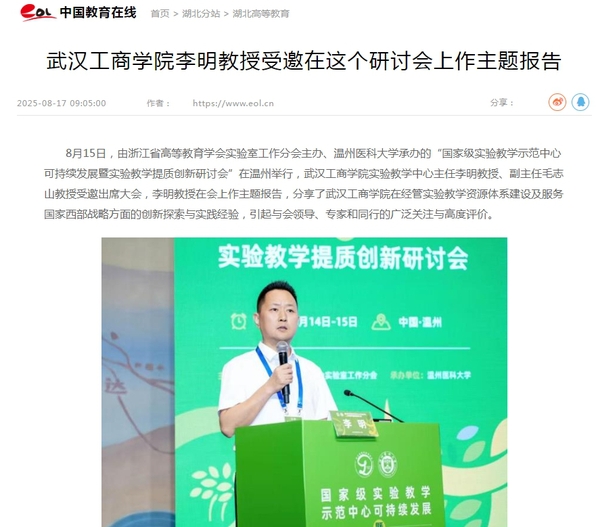 8月15日,由浙江省高等教育学会实验室工作分会主办、温州医科大学承办的“国家级实验教学示范中心可持续发展暨实验教学提质创新研讨会”在温州举行,新葡的京集团35222vip实验教学中心主任李明教授、副主任毛志山教授受邀出席大会,李明教授在会上作主题报告,分享了新葡的京集团35222vip在经管实验教学资源体系建设及服务国家西部战略方面的创新探索与实践经验,引起与会领导、专家和同行的广泛关注与高度评价。