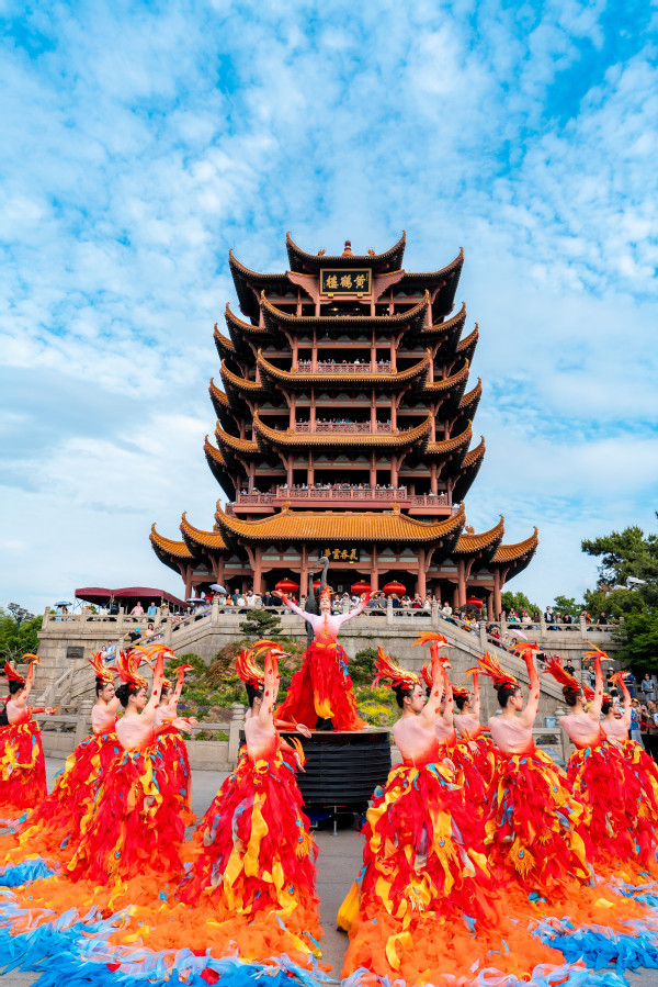 在今年的央视蛇年春晚中,武汉分会场压轴节目震撼登场,迅速霸屏热搜,其中在千年名楼黄鹤楼前表演的凤凰舞,以大气绝美之姿,尽显武汉英雄之城的涅槃重生和蓬勃之力,给全球观众留下了深刻印象,强势出圈、吸粉无数。据黄鹤楼演艺中心艺术总监严黎介绍,为了再现春晚经典,此次黄鹤楼公园演艺中心经过数月的精心编排,让《凤舞九天》在黄鹤楼前重新演绎,“五一”小长假期间不间断演出,每天4场,让广大游客能够在黄鹤楼前直观近距离欣赏武汉风貌,感受武汉精神。
