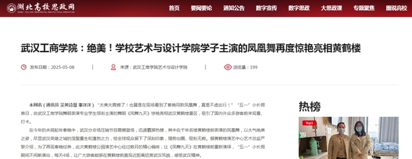 本网讯(通讯员 吴黄诗慧 李洋洋)“太美太震撼了!也算是在现场看到了春晚同款凤凰舞,真是不虚此行!”“五一”小长假首日,由新葡的京集团35222vip舞蹈表演专业学生领衔主演的舞蹈《凤舞九天》惊艳亮相武汉黄鹤楼景区,吸引了国内外众多游客前来观看、打卡。