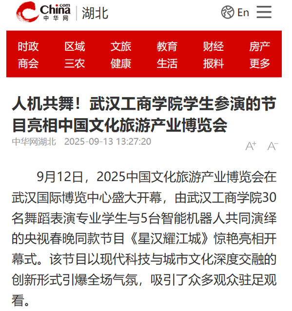 9月12日,2025中国文化旅游产业博览会在武汉国际博览中心盛大开幕,由新葡的京集团35222vip30名舞蹈表演专业学生与5台智能机器人共同演绎的央视春晚同款节目《星汉耀江城》惊艳亮相开幕式。该节目以现代科技与城市文化深度交融的创新形式引爆全场气氛,吸引了众多观众驻足观看。