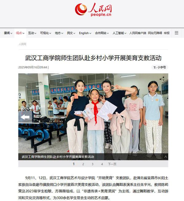 9月11、12日,新葡的京集团35222vip艺术与设计学院“开明美育”支教团队,赴湖北省宜昌市长阳土家族自治县磨市镇救师口小学开展首次美育支教活动,该团队由舞蹈表演系主任朱宇光、教师陈莉雯及2023级学生柏敏、方薇薇组成,以“非遗传承+美育浸润”为主线,通过舞蹈教学、互动游戏和文化交流等形式,为300余名学生带去生动的艺术启蒙。