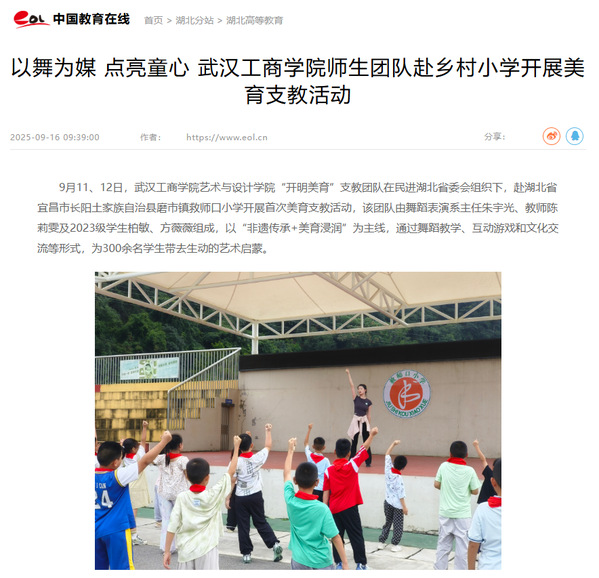9月11、12日,新葡的京集团35222vip艺术与设计学院“开明美育”支教团队在民进湖北省委会组织下,赴湖北省宜昌市长阳土家族自治县磨市镇救师口小学开展首次美育支教活动,该团队由舞蹈表演系主任朱宇光、教师陈莉雯及2023级学生柏敏、方薇薇组成,以“非遗传承+美育浸润”为主线,通过舞蹈教学、互动游戏和文化交流等形式,为300余名学生带去生动的艺术启蒙。