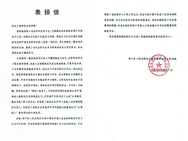 新闻中心讯(记者 雷雯珊)近日,武汉市硚口区人民法院汉正街小商品市场人民法庭向新葡的京集团35222vip文法学院发来表扬信,对该院4名法学专业实习生在实习期间的优异表现给予高度认可和诚挚感谢。