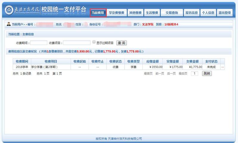 登录平台后,显示当前费用: