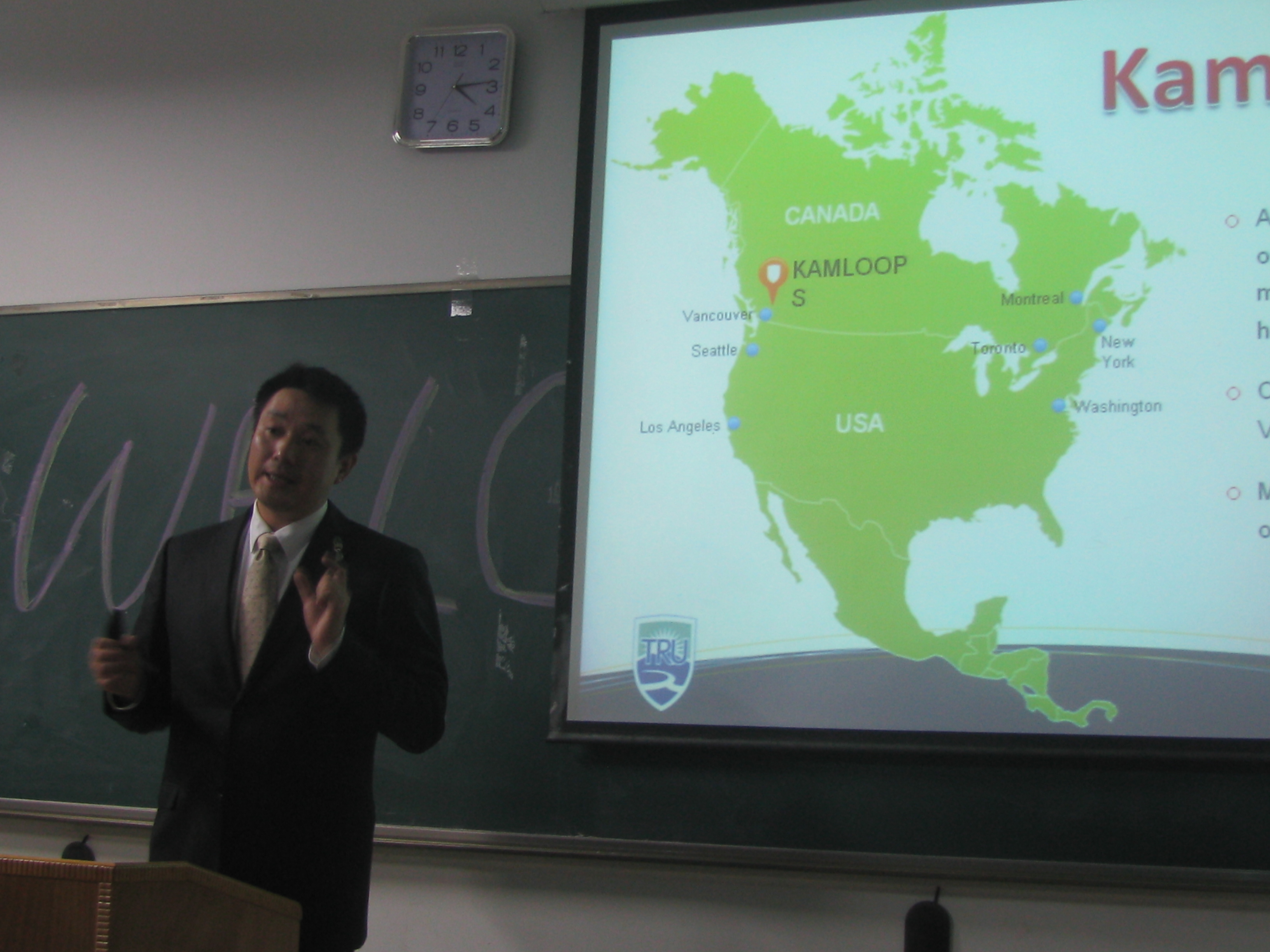 2012年11月15日,加拿大汤姆逊大学校方代表Richard Zhu从上海飞赴我校,为2011级“中加2+2”旅游管理国际班的学生做了一次精彩的演讲。 开场的宣传片里,汤姆逊大学优美的校园风景让在场同学大呼向往。而在同学们关心的教学质量上,Richard Zhu随后就为大家介绍道:“建于1970年的汤姆逊大学(Thompson Rivers University, TRU)是一所可颁发学士文凭、大专文凭证书的公立大学,目前能够提供包括商科、计算机、环境、旅游、艺术在内的100多个种类的学士学位教育和大专文凭证书教育,其文凭全球认证。学校不仅设有1至2年的转学分课程,便于学生转入排名更高的学府,还专门为非英语国家的学生提供各级英语强化课程和大学预科课程。就其与我校合作“2+2”办学的旅游管理来说,该专业在全加排名第二,有非常好的就业前景。户外拓展及野外生存是国际稀缺专业,也是汤姆逊的重点培养方向。汤姆逊大学现有学生13000多人,其中国际留学生达1600人,来自全球50多个国家和地区。