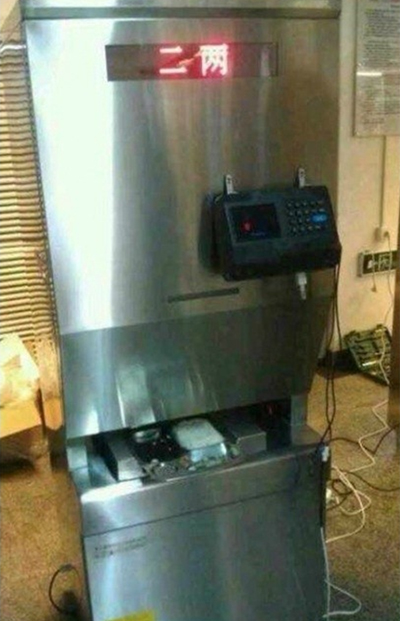 这台像自动取款机一样的“立柜”,高1.85m,宽0 .7m,厚度650 .8毫米,机身是食品级不锈钢材质,确保卫生安全。自动打饭机由广东伊立浦电器股份有限公司与华南理工大学后勤集团合作研发,是国内第一台全自动售饭机。